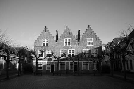 City view on old medieval houses in small historical town Veere in Netherlands, Walcheren, province of Zeeland
