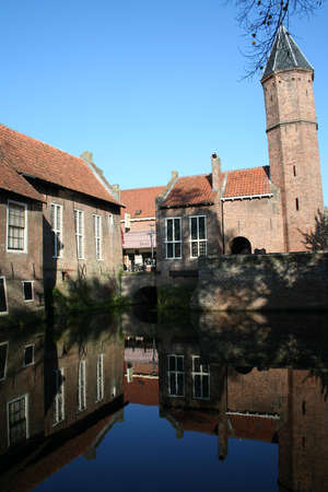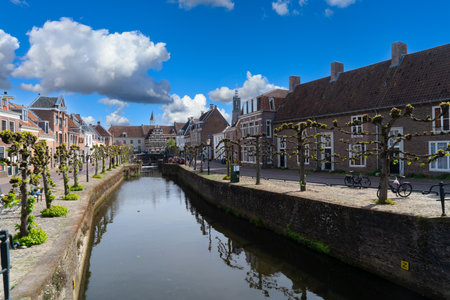 Historical Dutch cityscape with monumental houses and ditch in the center of Amersfoort
