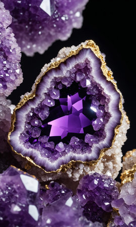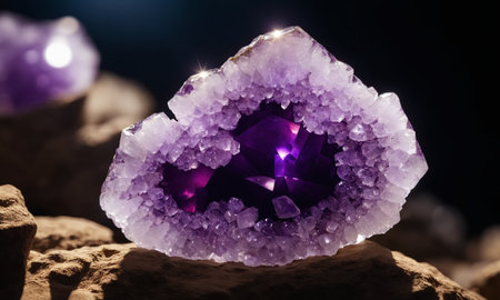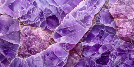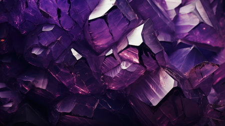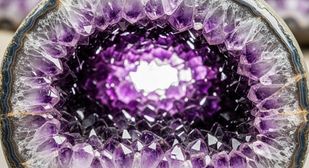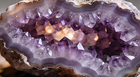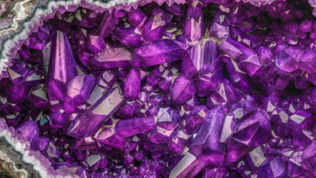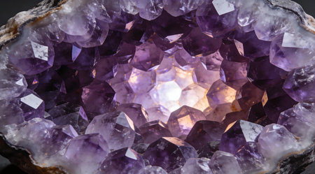 A creative digital illustration depicting Crystalline geode interior background in purple amethyst, faceted crystals, inner glow illumination, mystical gem treasure mood, commercial art. This AI-generated artwork features unique visual elements suitable for various commercial and editorial applications. AI-generated illustration.