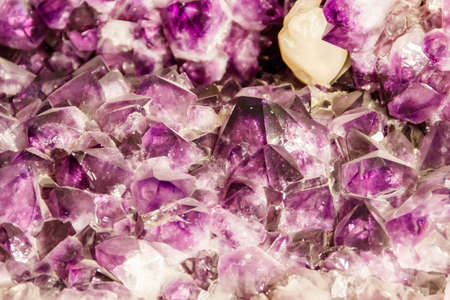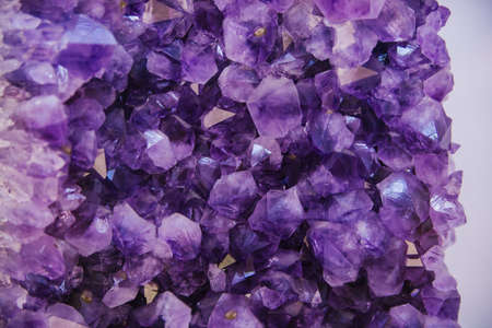 Amethyst purple crystal. Mineral crystals in the natural environment. Texture of precious and semiprecious gemstone. Crystal stone macro mineral, purple rough amethyst quartz crystals.