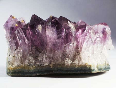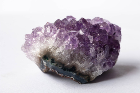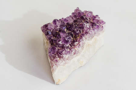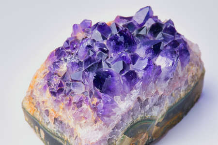 Macro Mineral Stone Amethysts in the rock on a white background close up