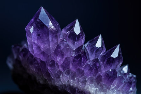 Amethyst crystals, shimmering with vibrant purple hues, glisten against a soft focused dark background A natural formation showcasing beauty and elegance in mineral structure