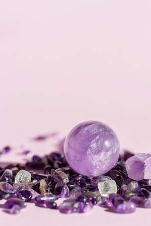 Crystal minerals for meditation on pink background. Magic Rock for Healing stones.