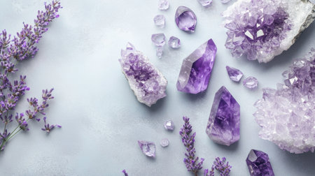 A serene arrangement featuring amethyst crystals and lavender flowers on a soft textured background, creating a tranquil and elegant visual experience.