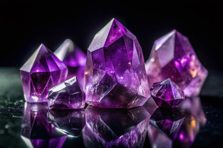 Amethyst Crystals Night Photography: Purple Gemstones on Dark Surface