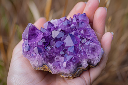 Close-up of a hand holding a vibrant raw amethyst crystal cluster, showcasing its natural purple hues and intricate formations.