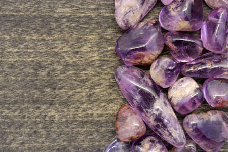 Rutilated amethyst jewel heap on black wood half background. Pile mineral pebbles texture. Place for text.