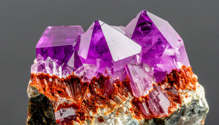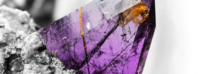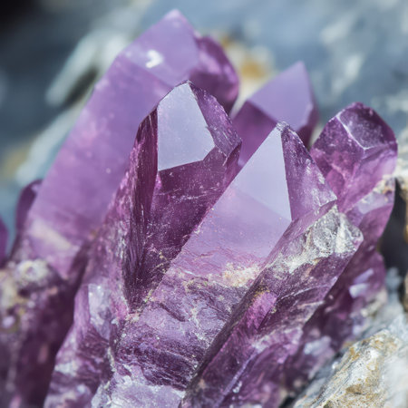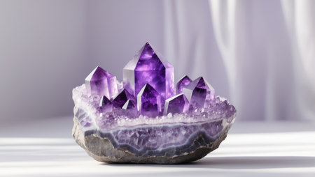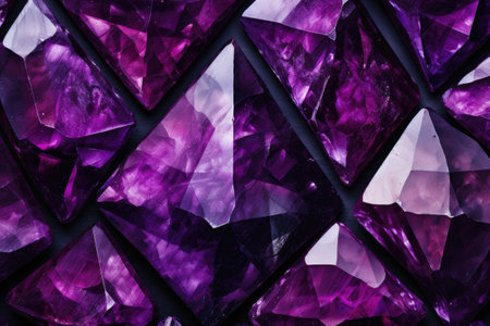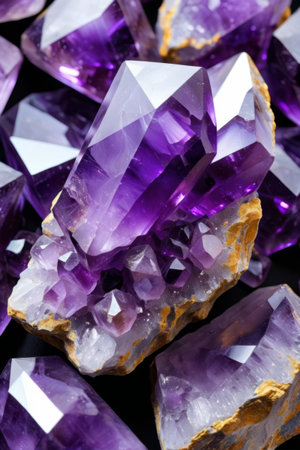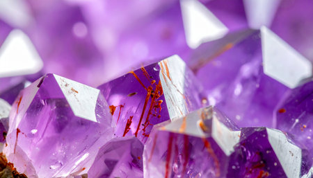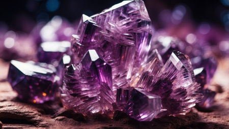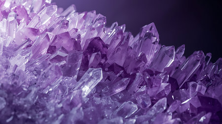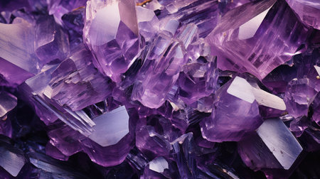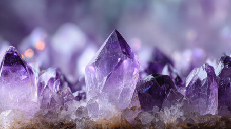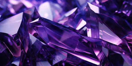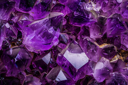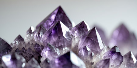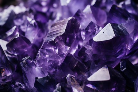 Close-up view of a stunning amethyst crystal cluster with sharp edges and rich purple hues, ideal for gemology themes.