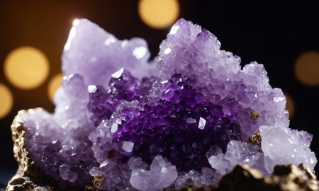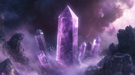 Amethyst crystals shining in a stunning cosmic background, displaying vibrant purple hues and mesmerizing sparkle, ideal for magical or mystical themes