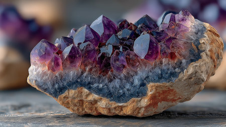 Close-up of a semiprecious crystal cluster with violet amethyst points and translucent mineral structure embedded in a rugged stone matrix, ideal for decorative uses.