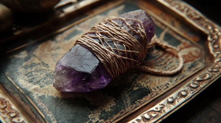 This captivating image features a stunning amethyst crystal elegantly wrapped in twine, beautifully placed on a vintage tray. Its rich purple hues evoke a sense of tranquility.