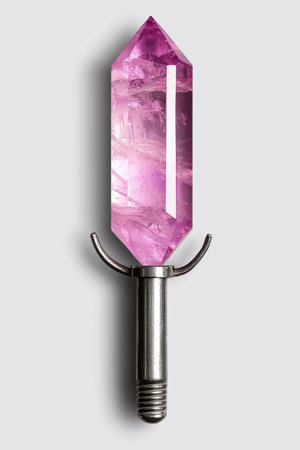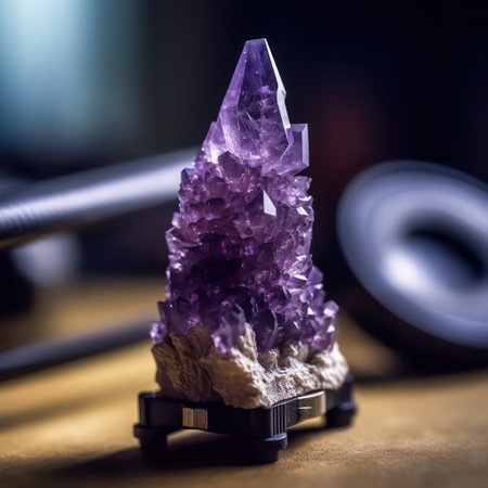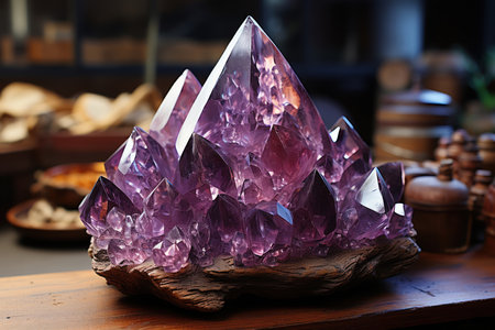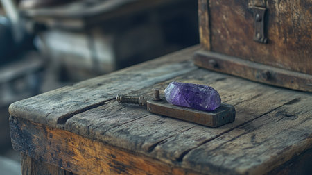 This captivating image features a vintage wooden table with a rustic tool and an eye-catching amethyst crystal, creating a serene and artistic workspace atmosphere.