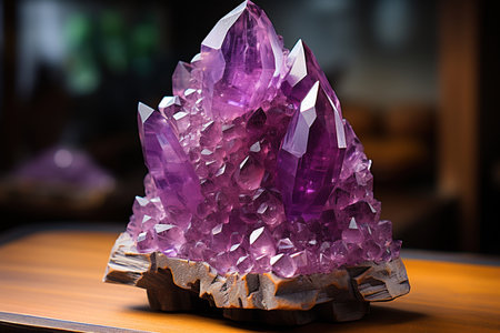 Amethyst crystal on a wooden table. Macro. Selective focus.