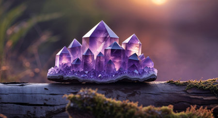 AI Generated. Amethyst crystals illuminated by sunset light creating a mesmerizing purple display in a natural setting