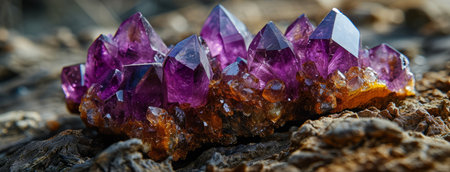 Bright purple amethyst crystals are clustered on rocky terrain reflecting light beautifully while showcasing their unique shapes.