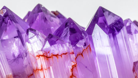 Detailed close-up showcases a vibrant cluster of amethyst crystals, their various shades of purple contrasting against a clean white backdrop, highlighting their unique formations.