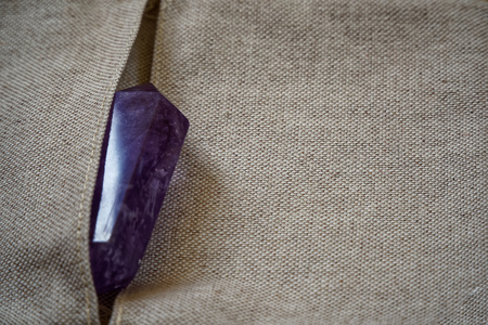 Crystal on linen fabric surface, mock-up for postcard or background for website and mobile devices. Gem colored in royal purple