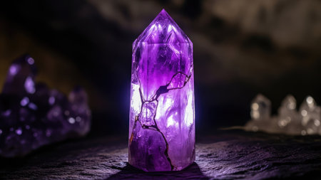 AI Generated. Amethyst Crystals Double Exposure Emanating Radiant Purple Hues in Closeup