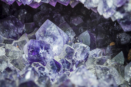 Amethyst crystals on a dark background. Macro. Selective focus.