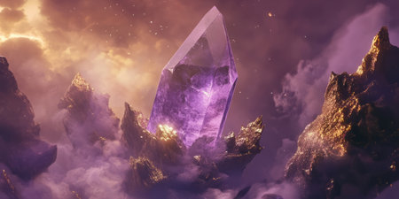 A breathtaking view of stunning purple crystals emerging from a mystical cosmic landscape, radiating a vibrant glow that captures the imagination.