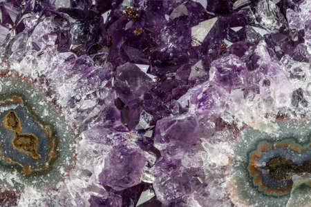 Amethyst purple crystal. Mineral crystals in the natural environment. Texture of precious and semiprecious gemstone. Macro photo of lilac amethyst crystals background. Background of amethyst stones