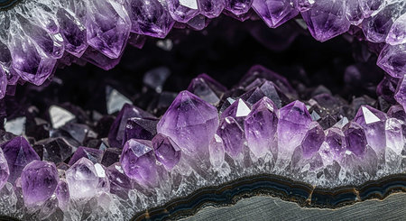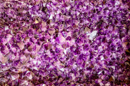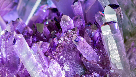 Close-up of natural amethyst crystals with shimmering purple hues, creating a textured abstract background perfect for use as copy space in design.
