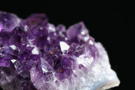 part of mineral purple Amethyst crystal quartz texture background with black isolated background and have some space for write wording