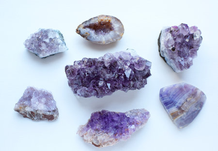 Macro Mineral Stone Amethysts in the rock on a white background close up