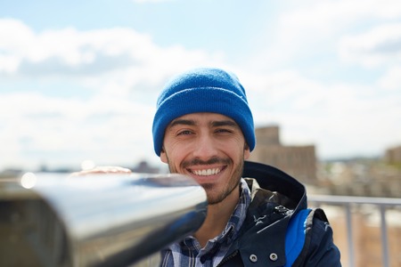 Joyful, smiling man looks with interest at the tower viewer, standing on the promenade, against the backdrop of the sea.
