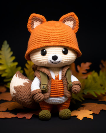 a crocheted fox sits in the leaves with pumpkins and other fall decorations
