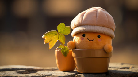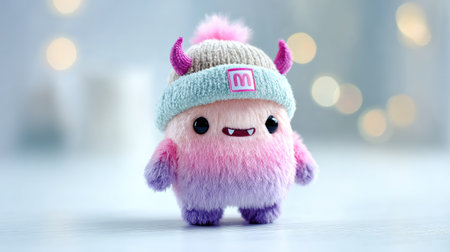 A fluffy cartoon character is featured against a softly blurred background. The character has a colorful, textured appearance and wears a winter hat with horns. The image's lighting is soft, suggesting a daytime setting. It could be suitable for various design projects, marketing materials, or editorial uses.