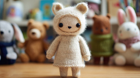 A charming knitted bear doll, the central focus, is displayed amongst other plush toys. The scene features a shallow depth of field, soft textures, and a warm color palette. The composition offers potential for illustrating themes related to childhood, handmade crafts, and creative expression. The image is suitable for various commercial and editorial purposes.