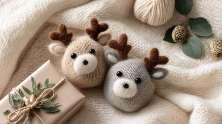 Adorable handcrafted reindeer figurines bringing warmth to a cozy setting, surrounded by natural elements and a beautifully wrapped gift box, perfect for holidays.