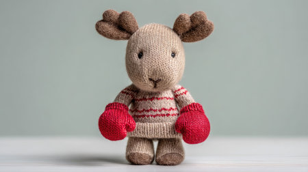 This charming knitted reindeer toy features red mittens and playful antlers. Perfect for holiday decor, children's gifts, or cozy winter themes.