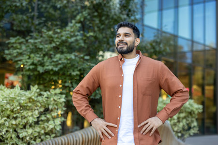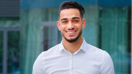 Male portrait happy indian smiling successful adult young man guy bearded businessman boss leader client manager executive entrepreneur wears formal shirt looking at camera smile toothy dental outdoor