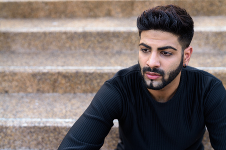 Close up of young handsome Indian man thinking