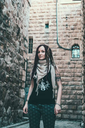 Portrait of a young woman with pink dreadlocks in Old Jerusalem