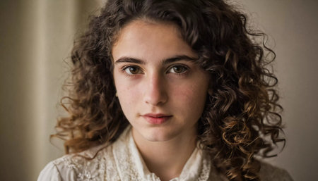 A young girl with beautiful curls stands serenely, capturing the essence of her home in Israel. The soft afternoon light highlights her features, creating a tender atmosphere.