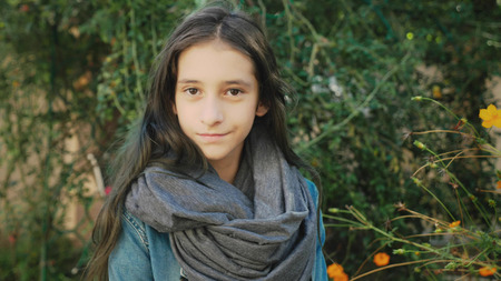Portrait of beautiful young girl walking outdoors in autumn. She poses for the camera