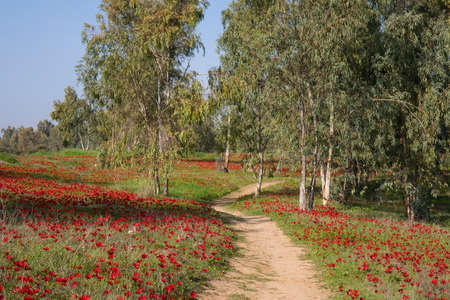 A path in a field of anemones , going on to a grove of eucalypti
