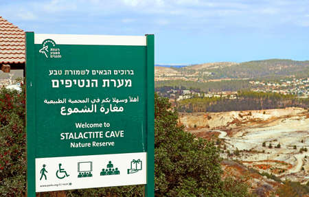 Information pointer of Avshalom Cave, also known as Soreq Cave, a large stalactites cave near Beit-Shemesh in central Israel