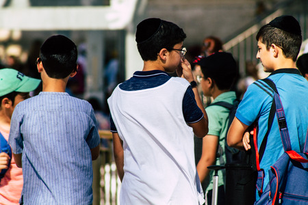 Jerusalem Israel June 19, 2019 View of young Israeli kid walking front the Western wall in the Old city of Jerusalem in the afternoon