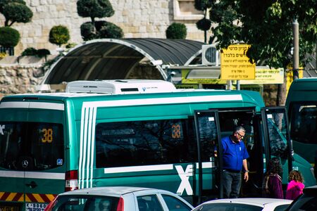 Jerusalem Israel December 17, 2019 View of a traditional Israeli public city bus rolling in the streets of Jerusalem in the afternoon