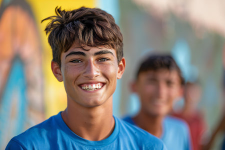 Portrait of smiling man in t-shirt standing against mosaic wall