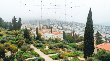 Bahai Gardens, Tranquil Green Oasis in Urban Setting Blending Nature, Technology, and Cityscape