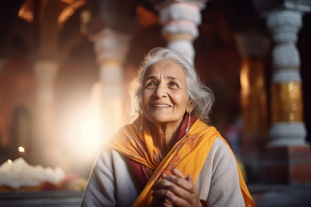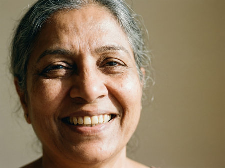 A joyful woman with gray hair and traditional attire stands in a peaceful indoor area. She smiles warmly, exuding a sense of calm and positivity. Sunlight softly brightens the background.