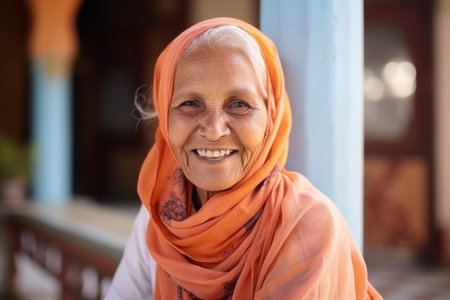 A joyful woman from Afghanistan smiles warmly, displaying a sense of resilience. Her colorful scarf reflects cultural heritage as she sits in her inviting home environment. Generative AI.
