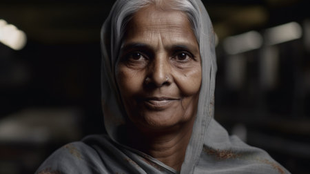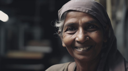 A smiling senior Indian female factory worker standing in warehouse. Generative AI AIG19.