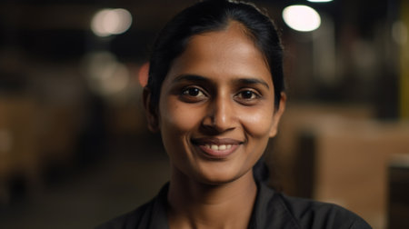 A smiling Indian female factory worker standing in warehouse. Generative AI AIG19.
