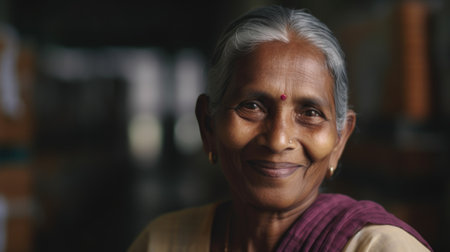 Portrait of a beautiful smiling senior Indian woman with gray hair wearing a traditional sari and gold jewelry